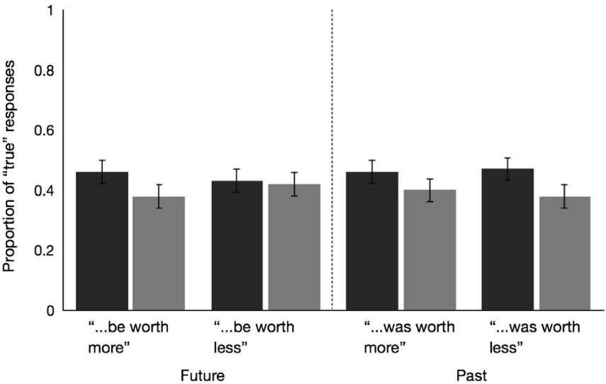 Résultats de l'expérience 4B de l'article : Newman, E. J., Azad, T., Lindsay, D. S., & Garry, M. (2018). Evidence that photos promote rosiness for claims about the future. Memory & cognition, 46, 1223-1233.