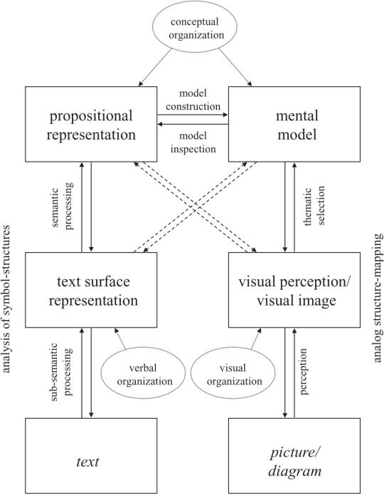 Images et textes peuvent être une source pour la construction de modèles mentaux. Cependant, elles n'ont pas exactement la même fonction dans le processus de compréhension: le texte est plus contraint que l'image, mais en même temps, il est sémantiquement mieux défini que l'image, et il est meilleur pour la "'conceptual guidance" pour la construction de modèles mentaux. L'image, ne dépendant pas d'un ordre de traitement pré-déterminé, permet un accès bien plus rapide à une information spécifique. En revanche, le contenu est moins bien défini sémantiquement.