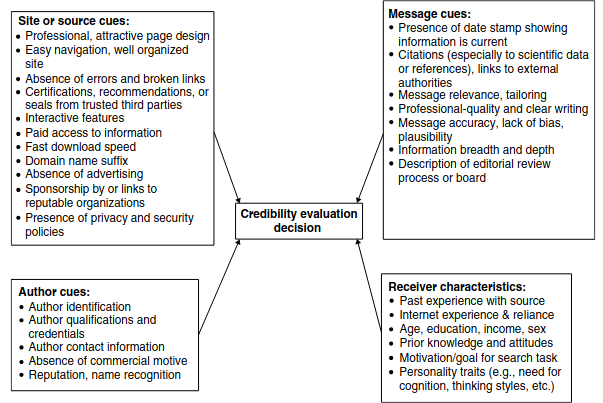 Metzger, M. J., & Flanagin, A. J. (2015). Psychological approaches to credibility assessment online. The handbook of the psychology of communication technology, 445-466. https://doi.org/10.1002/9781118426456.ch20 (pdf retrouvé ici)
