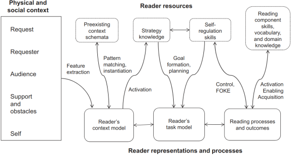 - le modèle du contexte: Il est relativement stable et centré sur la demande ou le besoin de lire, intégrant des éléments supplémentaires (e.g. contraintes de temps, le niveau des enjeux et l'accès aux ressources). Il peut être mis à jour en fonction des résultats d'activité et des retours d'information (e.g. des caractéristiques contextuelles initialement négligées peuvent devenir centrales dans la stratégie de lecture à la suite d'un obstacle ou d'un échec à atteindre son objectif